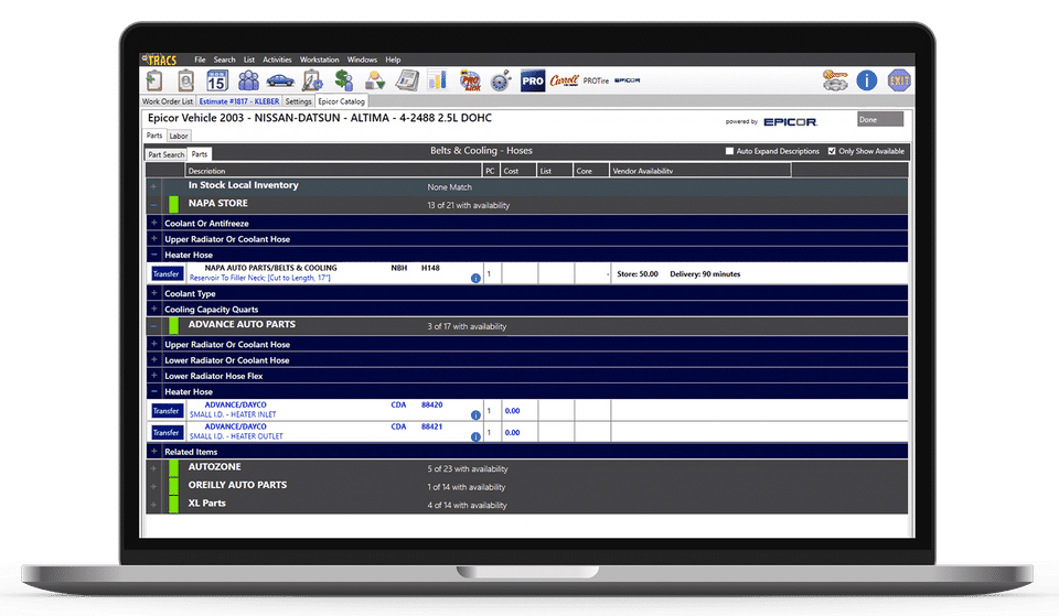 NAPA TRACS is the Auto Repair Software used for the below functionalities.