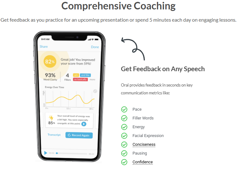 Orai’s interactive lessons are designed with gamified elements and practical tips to make learning enjoyable and effective. These lessons cover various topics, from eliminating filler words to improving vocal tone and managing nerves. The app customizes content based on user goals, offering a tailored learning journey. In addition to individual features, Orai also supports enterprise solutions. Organizations can use its dashboard to monitor team members' progress, analyze engagement, and encourage improvement through leaderboards and feedback systems. This makes it an excellent tool for corporate communication training.