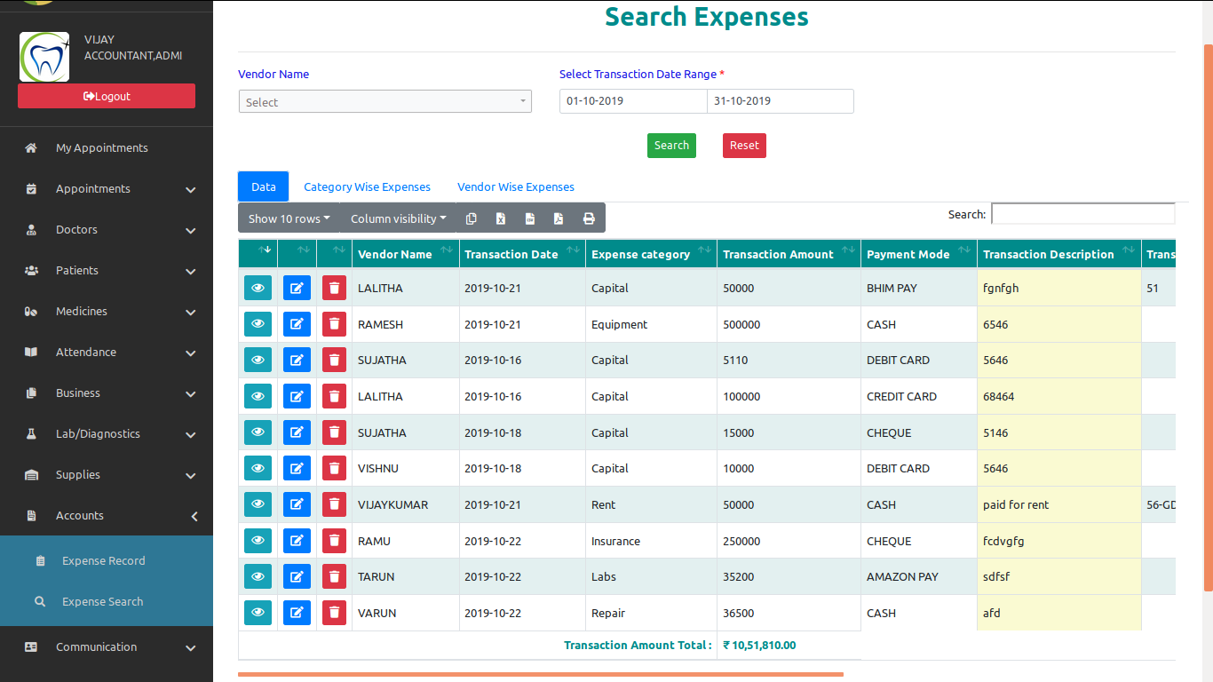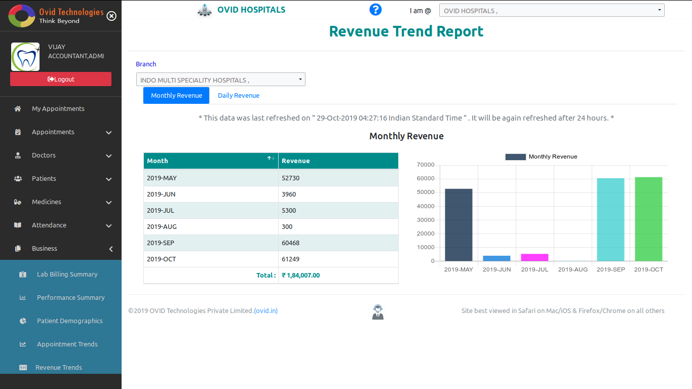 The revenue reporting can be done by date , doctor , date range, branch/location.