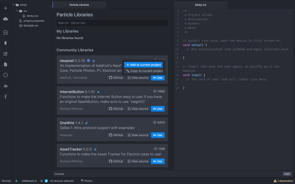 Particle is a very easy to use tool, it also has a highly customizable user interface which can be modified and adapted to our tastes and needs. It also has multilanguage support that allows us to write in more than one programming language.