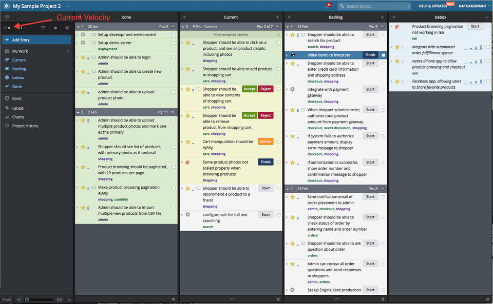 It's a basic sprint board that does what it does. It does a decent job of tracking stories, issues, and overall project progress and velocity. Simple "accept", "reject", and "finish" buttons make it easy to move stories along the sprint.