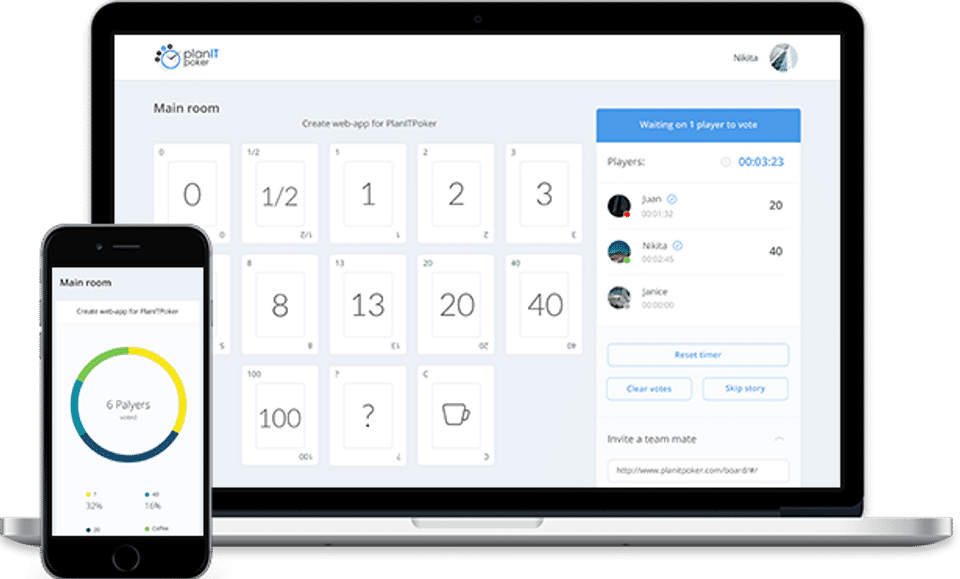 There are a number of really good features around it as well with showing the amount of time on story, skipping, re-voting and averaging the values. It also keeps a record of your estimations so that you can enter them in your tool of choice later.