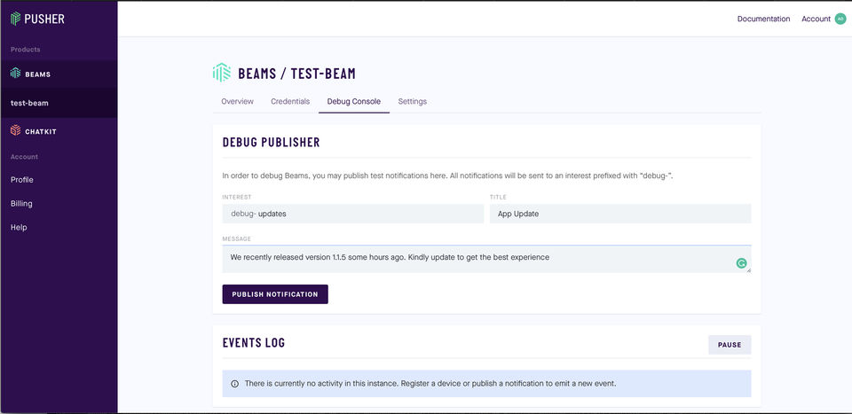 Pusher Beams is the Push Notification Software used for the below functionalities.