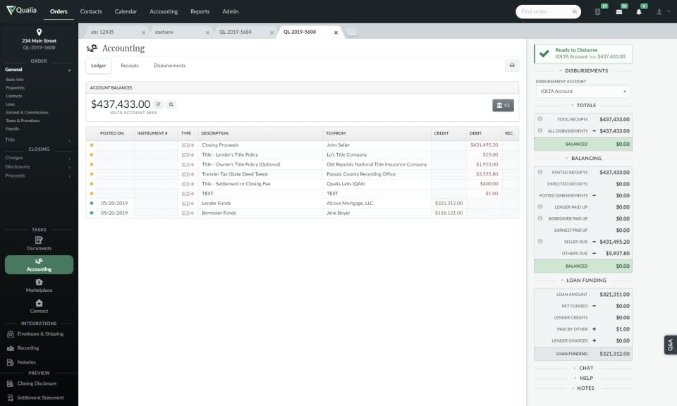- Vendor Integration: Place and track orders for title searches and HOAs with one click via the native Qualia Marketplace.