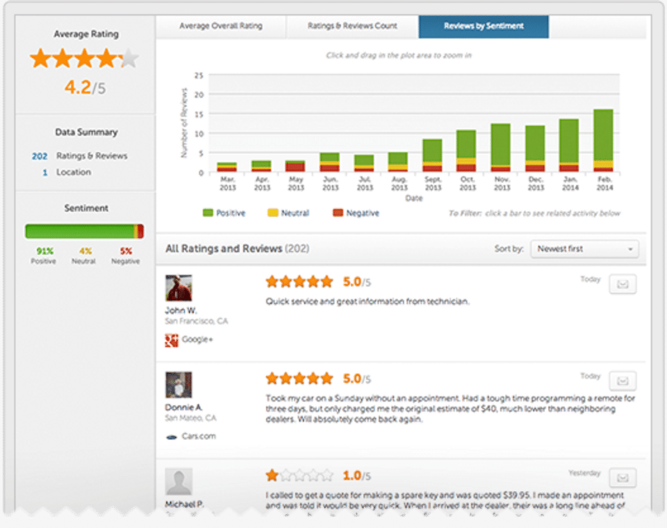 Buyer beware. This company makes false promises. If I could rate them 0 stars, I would. It's hard to manage your reputation score with incomplete data coming from its platform. When problems were found the Reputations team were unable to fix the issues. Company executive to NOT care about their customers. There are other Reputation management companies out there that can do a much better job. Don't waste your money on this one.