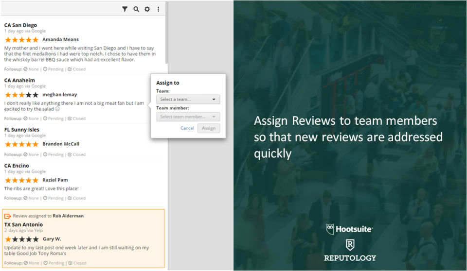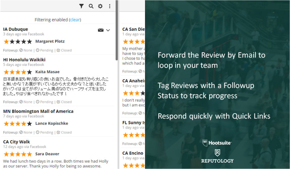 We are able to quickly, and easily see and respond to reviews on all of our sites which would take us hours of work.