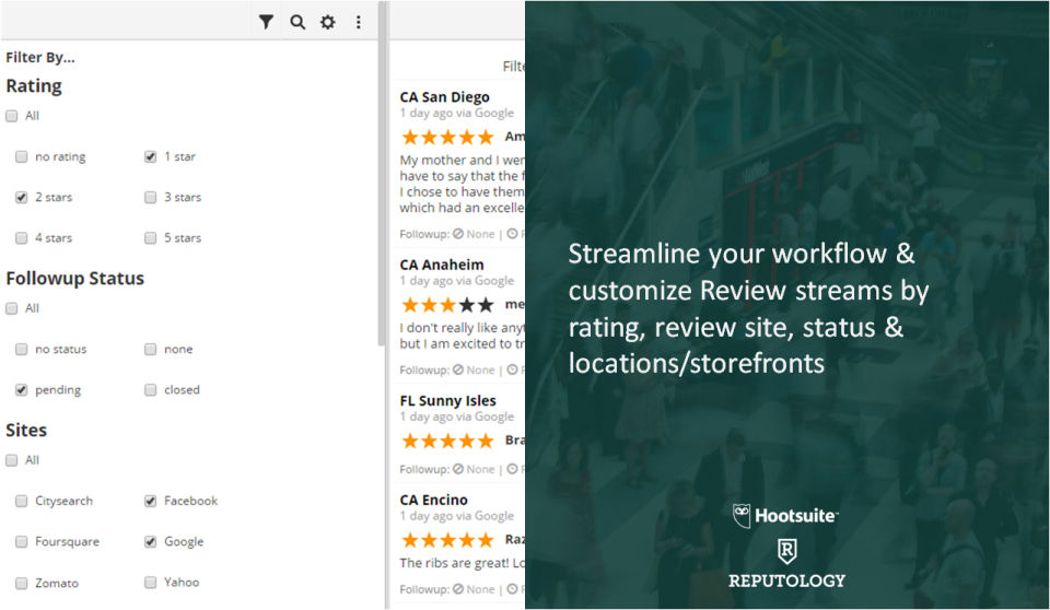Consolidating all your reviews sites into one convenient dashboard. Saves times and expedites response time to your customers.