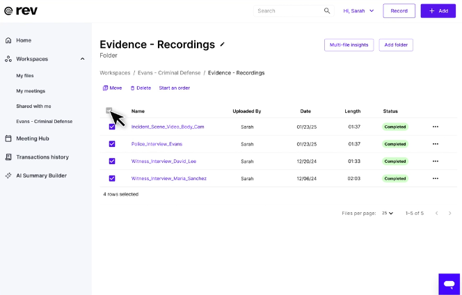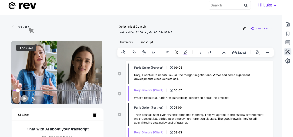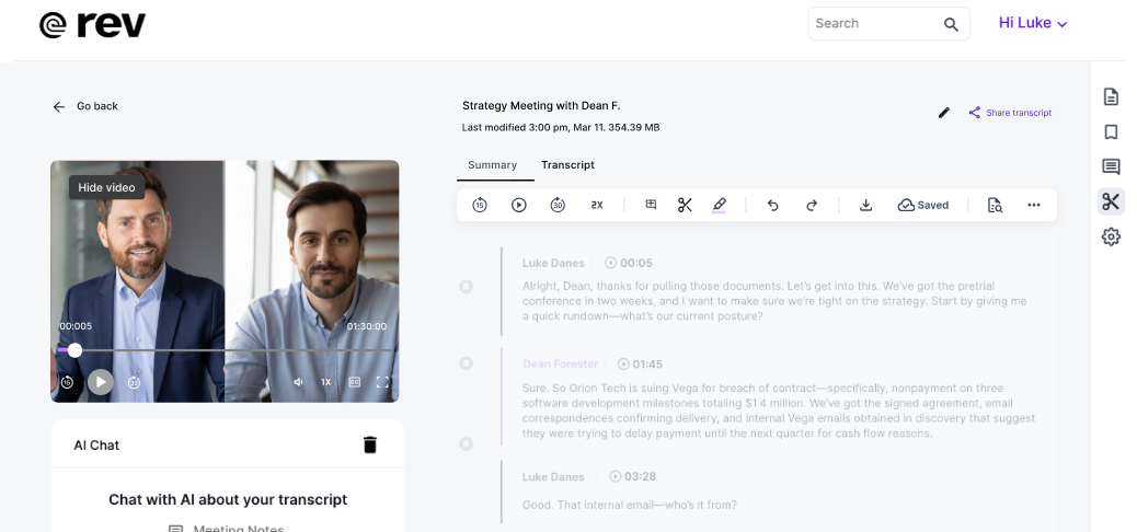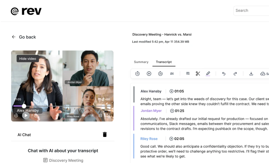 Rev’s platform includes an interactive transcript editor with highlighting, commenting, and clip-sharing. Built-in support for meeting transcriptions from Zoom, Teams, and Google means seamless integration into workflows. Users also benefit from AI assistants for summarizing transcripts, pre-built and custom AI templates, and multi-file analytical tools.