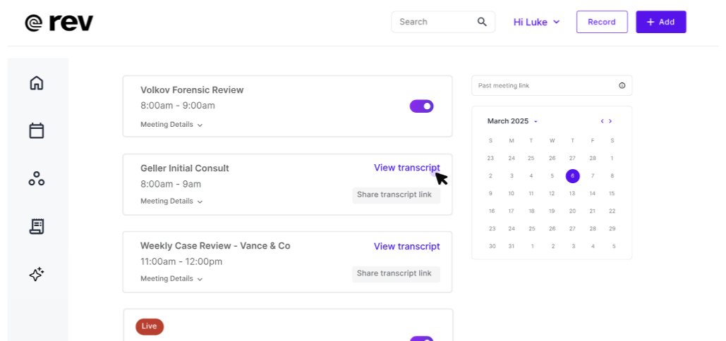 For highly accurate human transcription, Rev charges $1.99 per audio minute, with a typical turnaround of 5 to 12 hours. Add-on services include rush delivery, verbatim transcription, timestamping, and premium formatting, billed on top of standard rates. For large-scale legal transcription, there are specialized service tiers like instant rough draft (about 30 min turnaround), human rough draft (99% accuracy in ~3 business days), and court-ready certified transcripts (99.6% accuracy within ~5 days). These are often used by law firms.