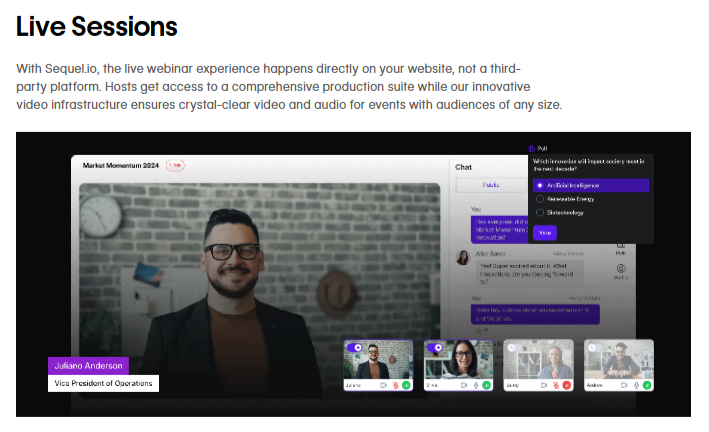 Sequel AI revolutionizes the webinar experience by offering a complete virtual event solution integrated with powerful generative AI capabilities. Unlike conventional webinar tools, Sequel AI enables users to host webinars directly on their websites—branded end-to-end across registration, live sessions, and replays. This results in stronger brand presence, improved SEO, and greater control over audience experience.