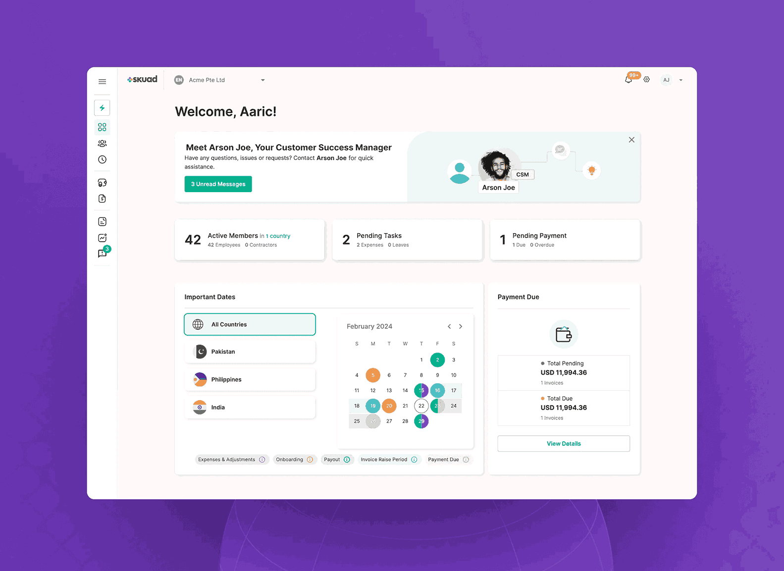 Skuad is an all-in-one digital platform designed to simplify global hiring, payroll, and HR management for companies looking to build remote teams. By eliminating the need to establish local entities, Skuad enables businesses to legally employ talent across 160+ countries while ensuring full compliance with regional labor laws, tax regulations, and benefits requirements.