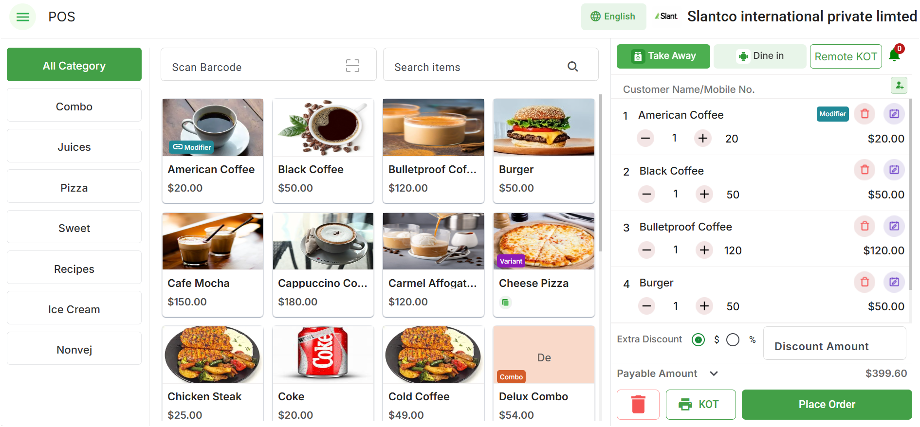 Slant CO is the Restaurant Billing Software used for the below functionalities.