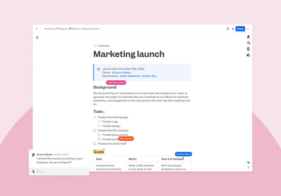 Fluid design experience, you can add tagging to your notes and organize them into the structure your team already have. And you can interact with different sets of people in your organization simultaneously. It is like a slack for knowledge, because we mostly store all of our ideas, knowledge, pitches, notes, strategies in one place, and we love that you can collaborate all of that instantaneously in one place.