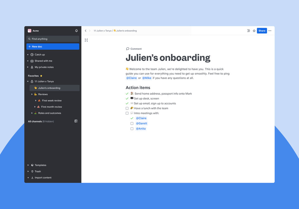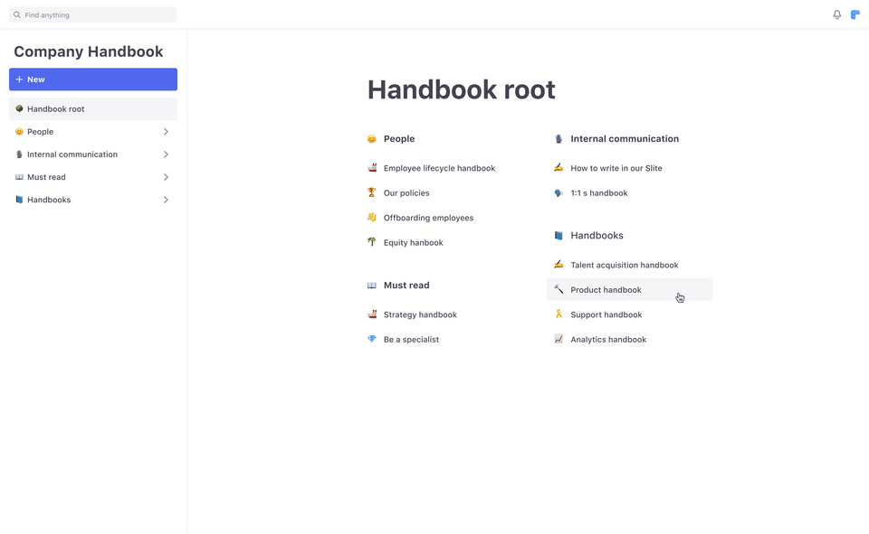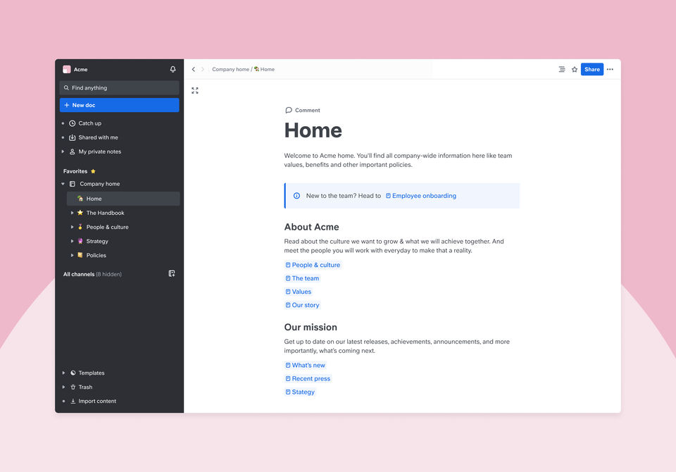 Slite has given me a workspace for topics that I have not been putting as much effort into as hardcore selling like employee onboarding with templates that I can copy and adapt it also does this same magic for other topics like customer success