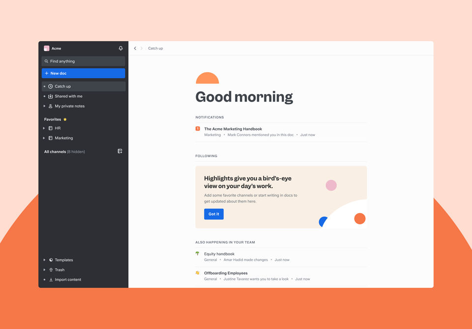 We have been using Slite since its early stage, and it is wonderful. Only one thing, it has some few bugs around it. It is annoying sometimes because you have to reload, but the annoying part outweighs its benefits. The free version also has a huge limit gap, but I understand why that is so. So I would save my rant for later.
