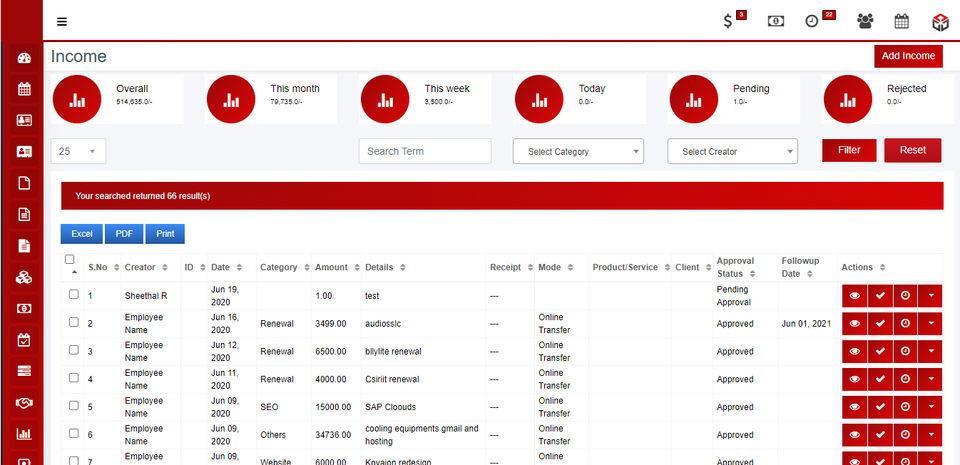 Solid Performers CRM is mainly solving the followup reminder problem with regards to both new leads and existing clients. Also, if we want to check all the previous history of communication happened with them, it is very easy to find and understand the history in less than a minute. This includes proposal, proforma invoice, invoice, payment received, pending payment and any manually enter data.