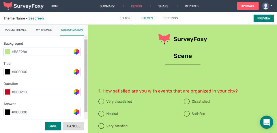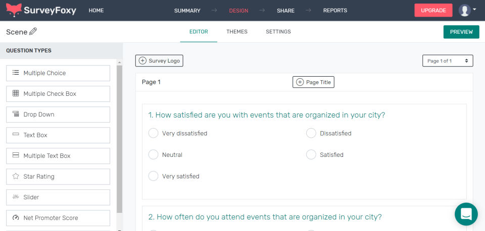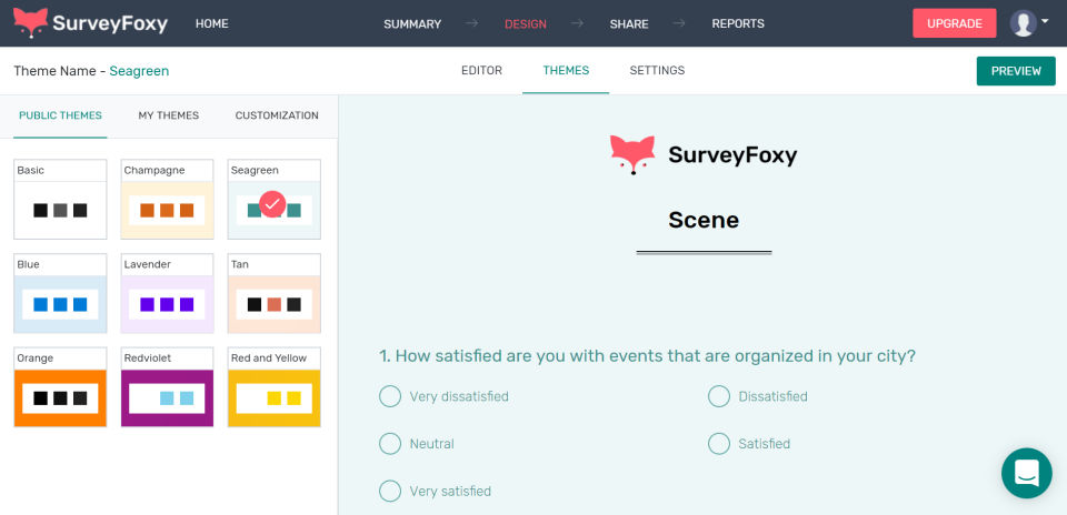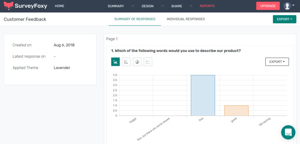 SurveyFoxy is a powerful tool that enables me to create surveys and collect necessary information from my target group. You are provided many templates, so sometimes you don't have to create your own, as a template meets your requirements. The process of designing a survey is intuitive; you can choose from lots of question types, themes and more advanced tools (Captcha, logo, date range, it's highly customizable, so you can build a survey looking and sounding personalised to your needs. Statistics are presented in colourful and clear diagrams; you are shown the number of total responses or how many persons skipped the question if the answer wasn't necessary. The interface is transparent, and everything is divided into thought-out sections, so you could find what you actually need effortless. The platform integrates well with social media, mailings and websites so that you can share your surveys anywhere.