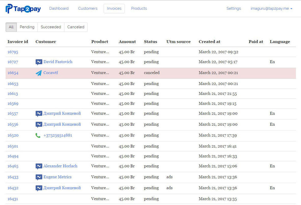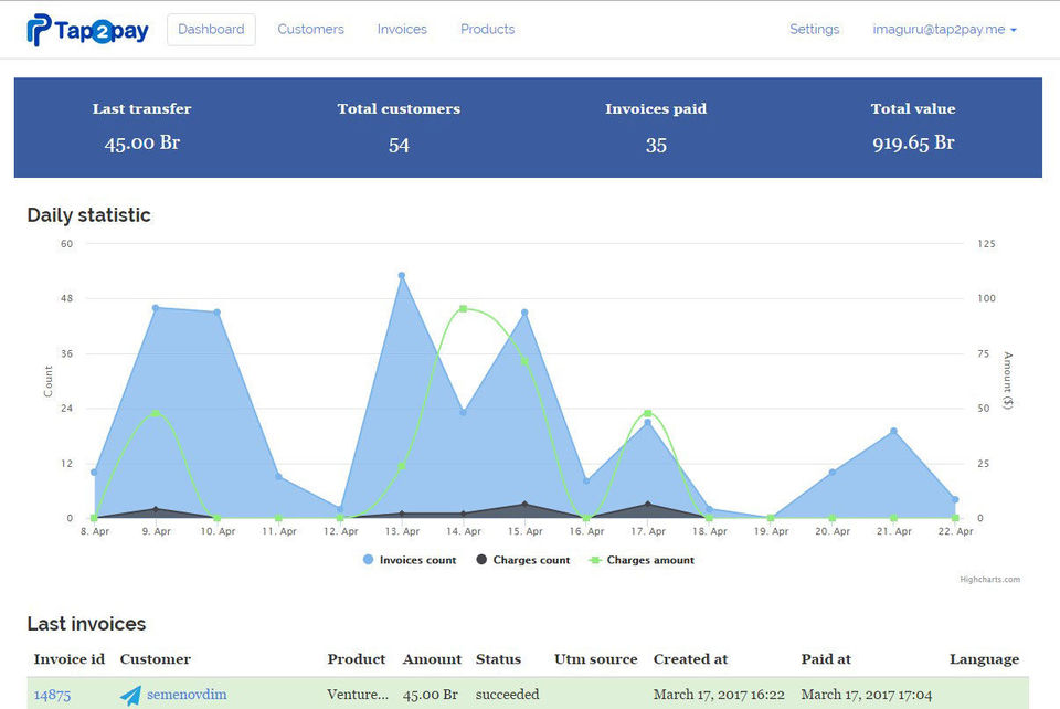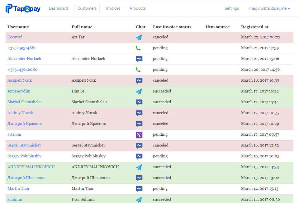 I can support my customers and chat with them, sent notifications. Thay can pay in two clicks right in messengers.
