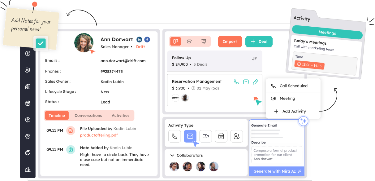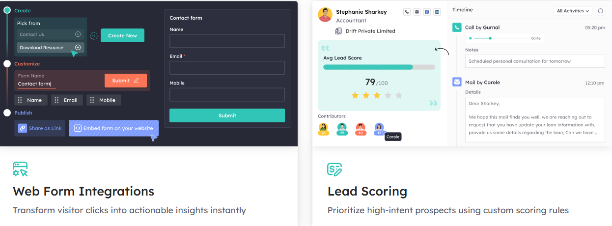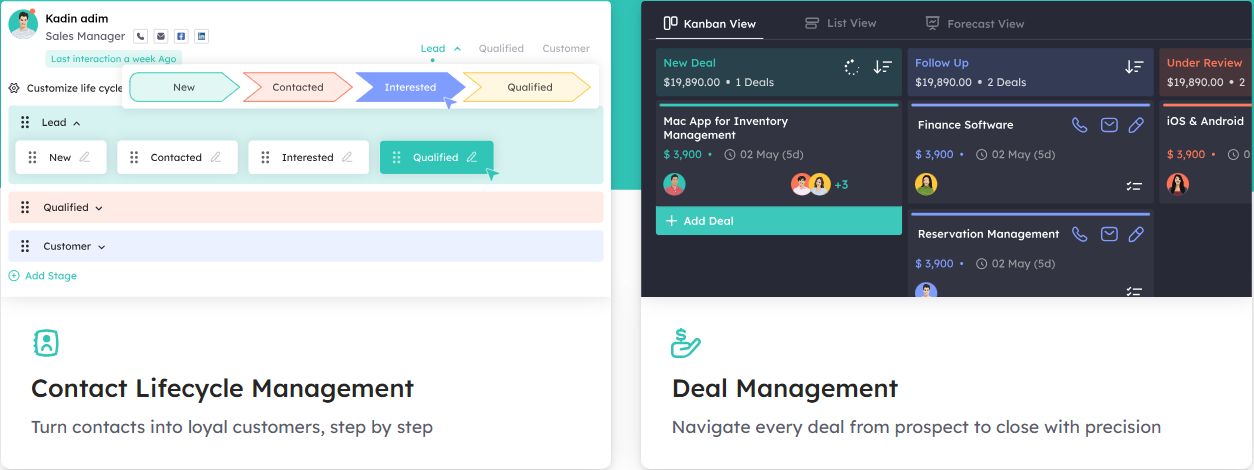 Lead & Deal Management: Visual pipelines, lead capture forms, custom deal stages