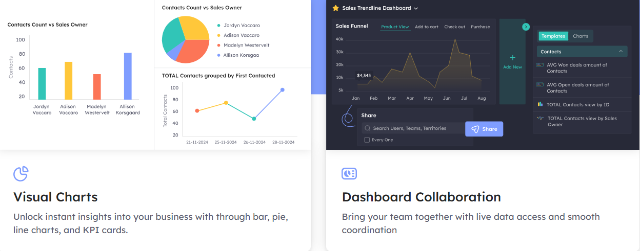 Dashboards & Reports: Live reports, custom charts, data insights, shared dashboards