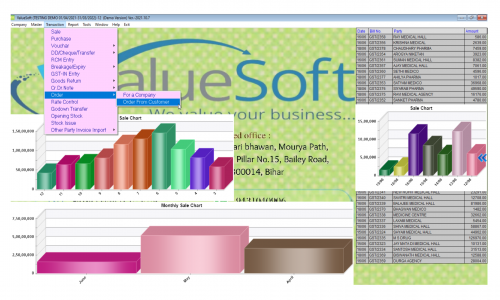 ValueSoft is a software company providing software for Inventory and Accounting control with full GST features. It has software for Pharma, FMCG, Vehicle showroom, Mobile shop, Electric shop, Hardware shop, POS Software, Automobiles spare part, Garments shops, Electronics shop, Jewelry shops. ValueSoft is simple to use and easy to learn. ValueSoft is very flexible according to your business. You can craft bills and generate reports in less time compared to other software. ValueSoft gives nearly the performance in networking as on the server. We have only one version of the software in which we provide all the features. Full-screen software, sending or sharing reports via WhatsApp, mail, SMS, Tally export are other features. ValueSoft has features like GSTR return filling,