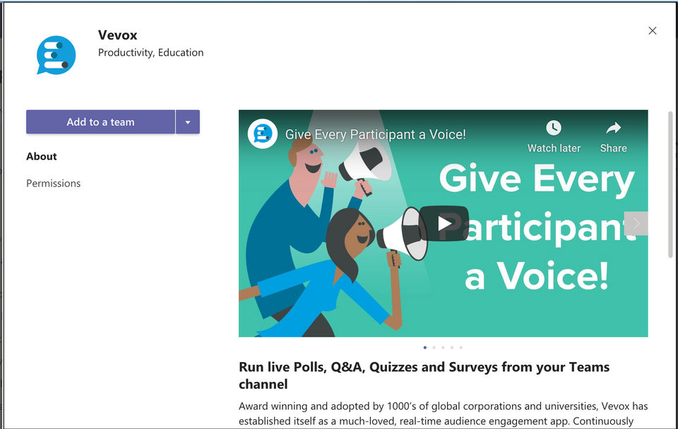 Vevox polls are fun! Our organization used the free version of Vevox for our monthly board call. It was a lovely way to 1) check in with board members during the call to ensure everyone was remaining engaged and 2) a fun way to obtain board member thoughts in any anonymous way. We seemed to able to obtain their thoughts and opinions rather quickly just by asking them to answer 3 poll questions. It was fantastic! We have also received great support from Vevox offering time to discuss options and ways to integrate the platform into our existing online presentations and meetings. We look forward to learning more about Vevox!