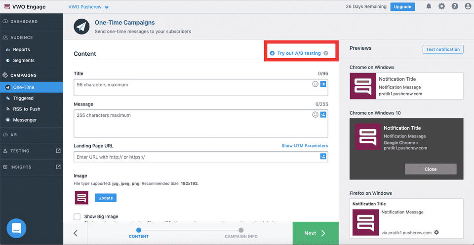 VWO Engage is allowed 0 Days Free Trial.
