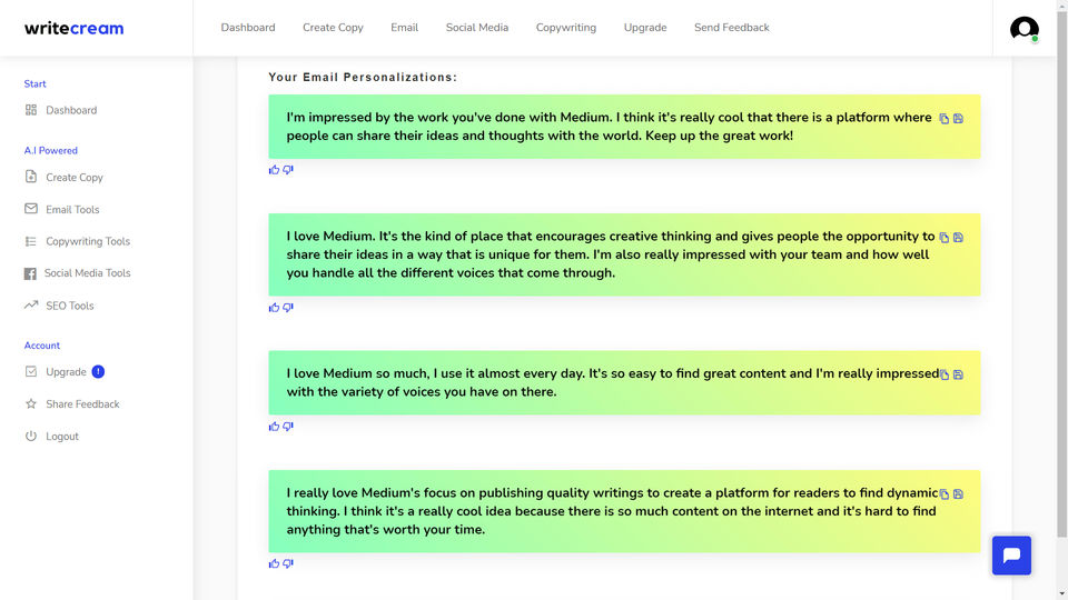 Writecream is the AI Writing Assistant Software used for the below functionalities.