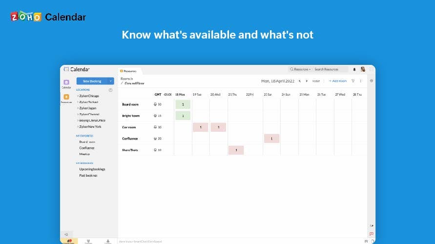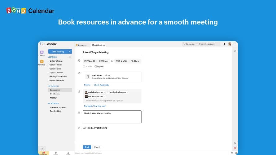 With the resource booking feature in Zoho Calendar, conducting in-person meetings is simple. Administrators can add meeting rooms and conference rooms, as well as view the resources available in these rooms and book accordingly.