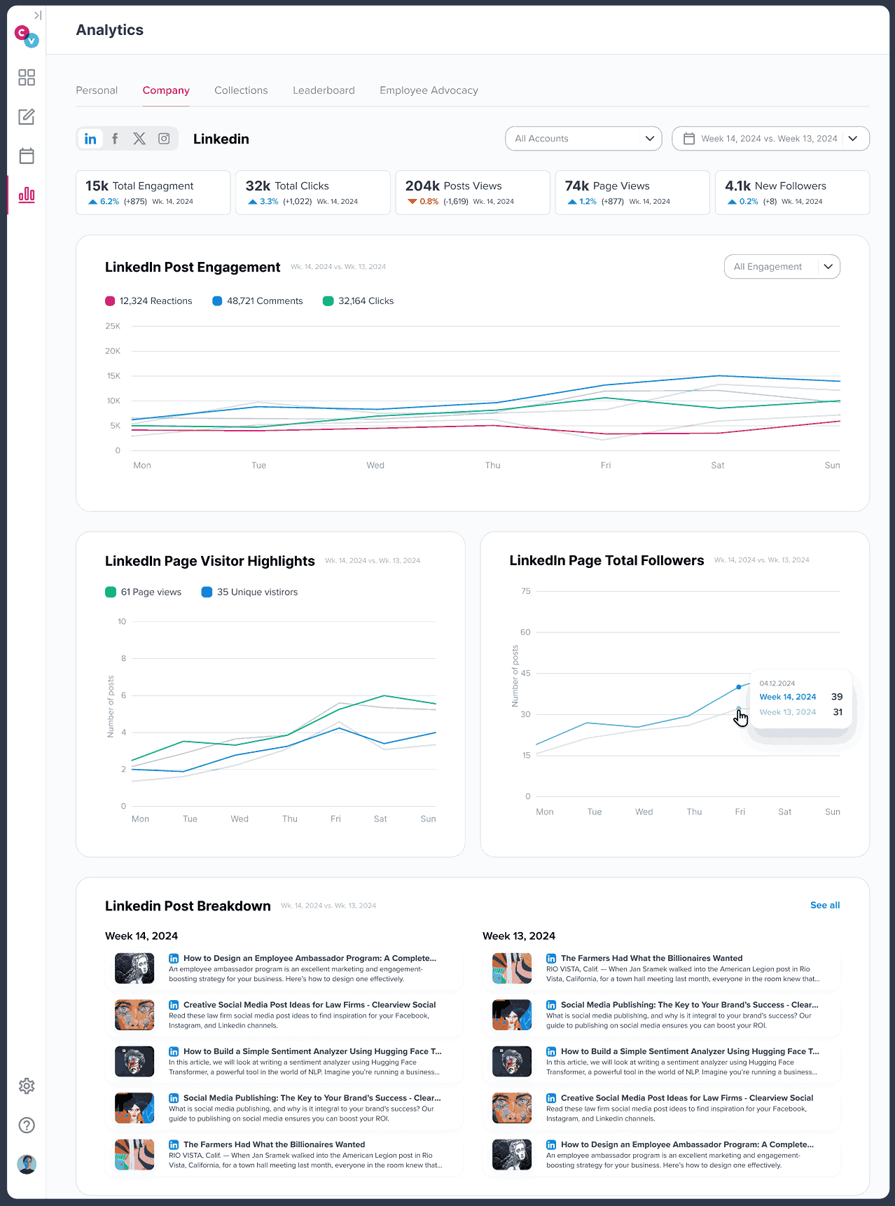 Clearview Social focuses on simplifying content sharing for law firms, agencies, and B2B teams. It’s one of the easiest-to-use employee advocacy tools out there.
