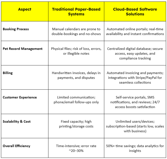 This table highlights how cloud-based software transforms kennel operations compared to outdated paper systems. From booking to billing, it shows clear wins in speed, safety, and satisfaction, making daily tasks smoother and more reliable.