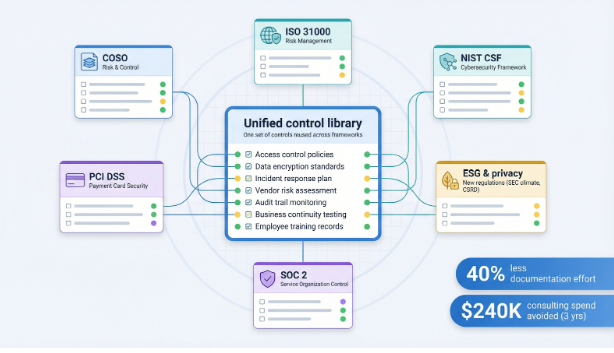 Compliance demands keep growing. Eighty-five percent of companies say requirements became tougher during the past three years, according to PwC. Platforms that ship with pre-mapped libraries, such as COSO, ISO 31000, NIST CSF, PCI DSS, SOC 2, and newer ESG and privacy mandates, reduce the amount of control mapping you have to do by hand.