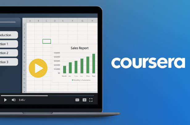 Coursera’s Excel Skills for Business Specialization from Macquarie University feels more like a mini-semester than a weekend tutorial. Four sequential courses (Essentials, Intermediate I, Intermediate II, and an Advanced capstone) each end with graded projects, so you demonstrate skills instead of merely watching them.