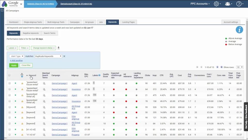 This will save hours in changes you should be making weekly. It also identifies any issues immediately and will alert you when you have ad groups without ads or if your landing pages are ineffective or leading to error pages.