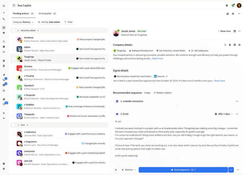 Duo AI Copilot – Offers daily prospecting signals and automates multichannel campaigns.