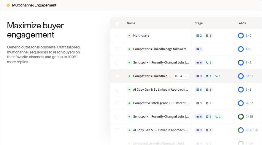 Multichannel Sequences – Coordinates outreach via email, LinkedIn, and phone.
