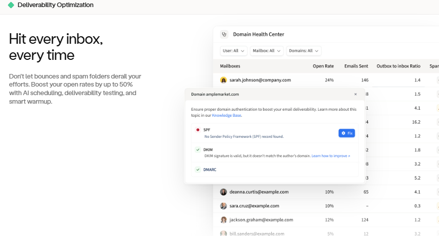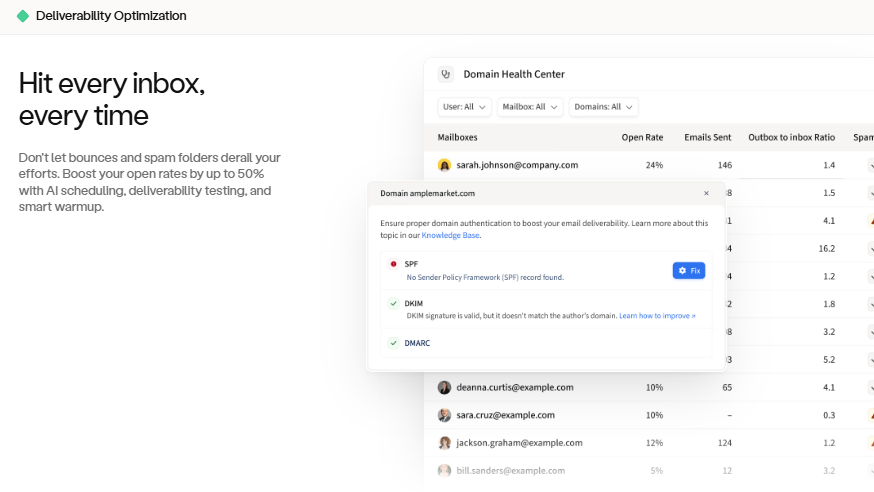 Intent Signals and Job Change Alerts help users pinpoint when a lead becomes a high-priority target. Amplemarket also ensures high deliverability through its domain health center and deliverability tools, reducing the risk of emails landing in spam.
