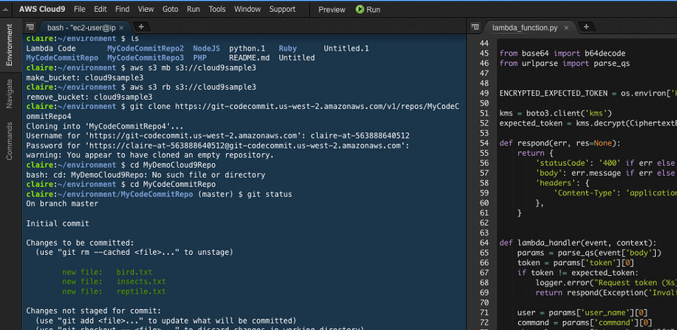AWS Cloud9 is the Online IDE used for the below functionalities.