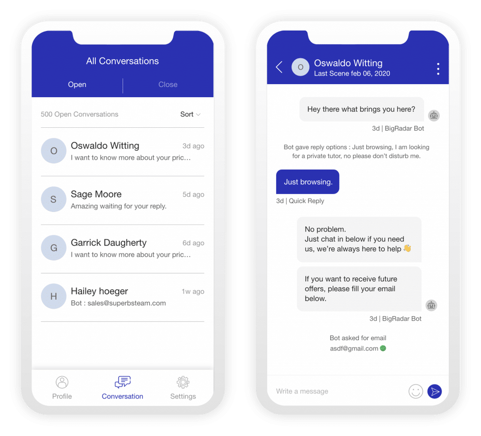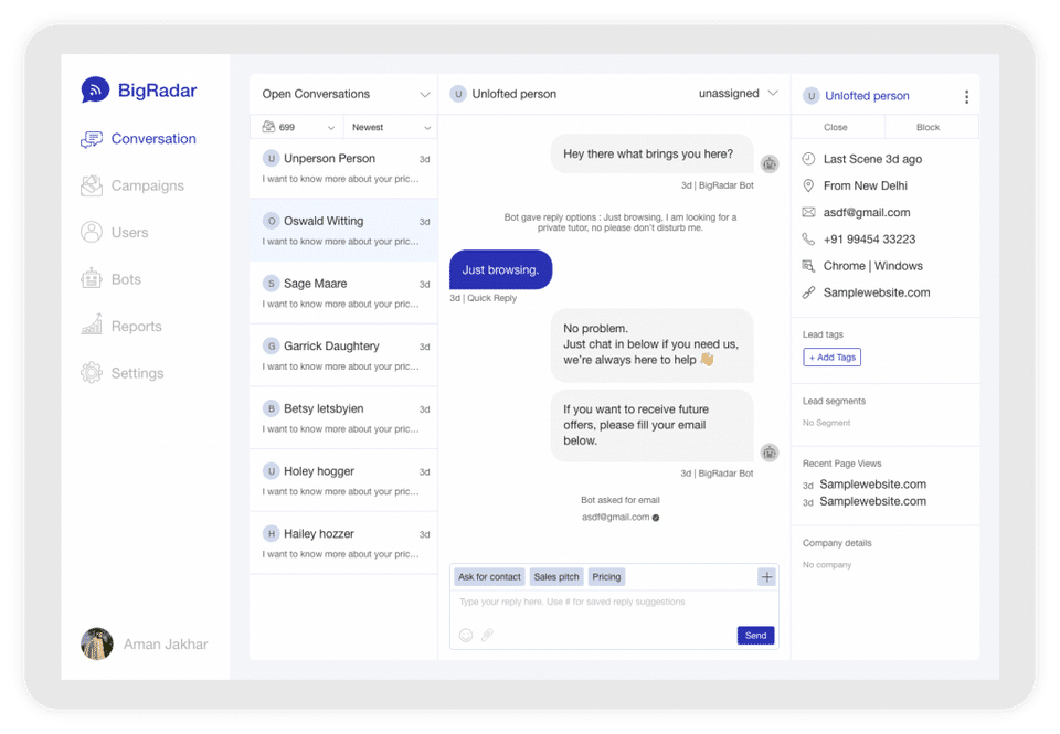 using BigRadar chatbot to its fullest capacity, whenever a visitor comes on my website I push a special message to start a conversation and then get their contact information for future updates. BigRadar helps me with all the user data I get from chat, I can put multiple condition and filters to get exact user data and send them an email notification. BigRadar really help me to connect with my users.