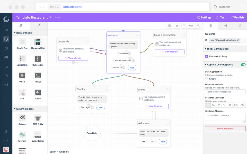 I really like BotStar Modules and CMS features. The Modules allows me to group several related blocks, so that I can organize my chatbot better.