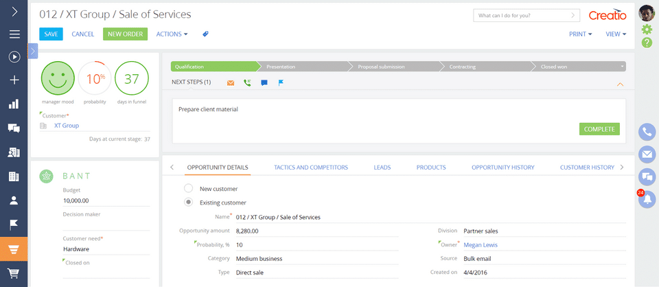 Creatio has excellent customizing capabilities that can fit the organization's needs. It has features that help in automating business processes--user page creation, task creation, target marketing, automatic sending of emails, business process structuring, many more. It really helps with data management and customer relations.