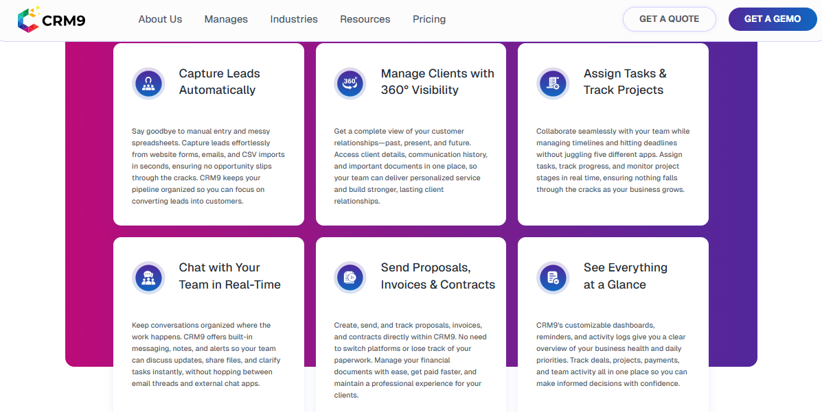 Overall, CRM9 combines a flexible, secure architecture with AI enhancements and a user-centric design. It supports the entire customer lifecycle—from lead generation to ongoing service and project delivery—making it an all-in-one CRM choice for growing businesses.
