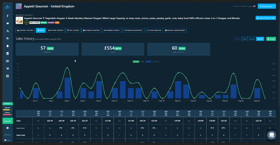 There is a free plan available which gives everyone a chance to try their service before paying for expensive plans. the customer support is absolutely fantastic, they are online all the time and replies very quickly, more than that they know what they are talking about and the replies are absolutely satisfactory for me. Now coming to the features the main tools of the website include a product research tool and a keyword research tool. the product research tool is very easy to work with, all you have to do is find the ASIN of the product you want to track and add it, the app will automatically grab the data for you about that product and similar products if you want. i have to say there is some serious insight in the data, its not normal search volume and review stats but also the sales insight to the product. the keyword tool is also similar that find search metrics on Amazon for the given keyword and ranking of products for the given keyword. if you're an amazon seller this tool is absolutely worth it. the premium pricing is very affordable. the dashboard is dark and beautiful, the analytics are shown alongside graphs so its very easy to compare it.