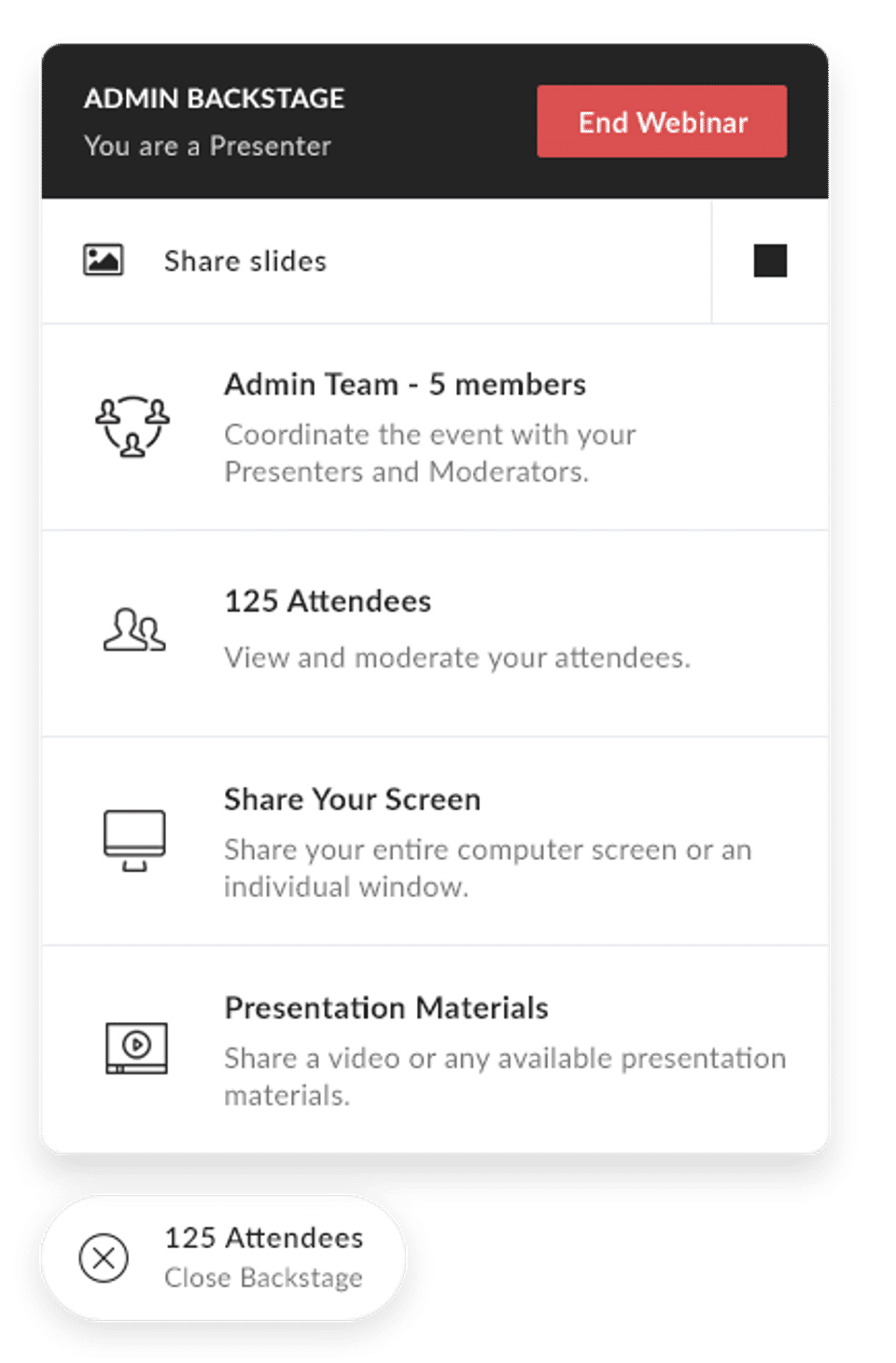 Demio is clean and simple to use, and also doesn't require an app to be downloaded. I also love how you can load mp4 video files and play them during your webinar...no need to use YouTube. Also, the fact that you can completely customize and brand your registration page for each event is awesome, and the analytics are great.