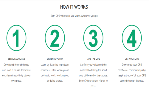 Traditional methods of earning CPE credits often involve attending scheduled webinars or in-person seminars, which can be time-consuming and inflexible. Earmark CPE addresses these challenges by leveraging the popularity and convenience of podcasts. Users can select from a diverse library of courses, each associated with specific podcast episodes covering various accounting and tax topics. This approach allows professionals to learn at their own pace, whether during commutes, workouts, or other activities. The process is straightforward: users choose a course, listen to the corresponding podcast episode, and then complete a brief quiz to assess comprehension. Upon achieving a passing score, they receive a CPE certificate, which is stored within the app for easy tracking and compliance reporting. This method not only makes earning CPE credits more convenient but also enhances the learning experience by integrating it into everyday life.