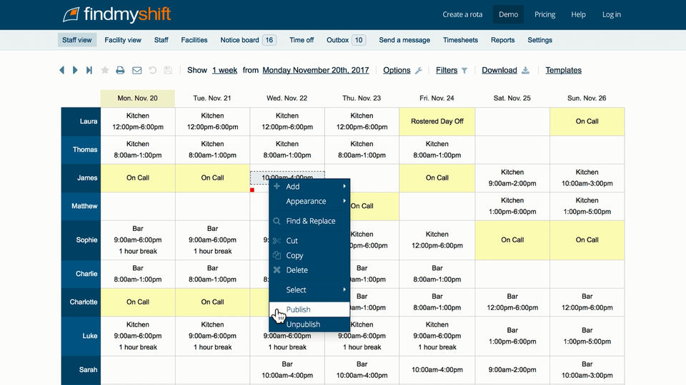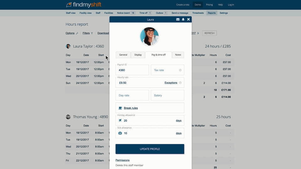 We use this software to manage rota and the process became a breeze. No need to disturb individual employees to know the precise staff rota. They can have their own login and put in the system their requests for day offs or shift changes without having to deal with often time consuming submission and approval processes. The system stores and keeps everything recorded.