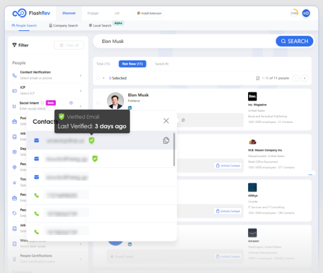 With a database covering over a billion verified business contacts and companies worldwide, FlashInfo enables highly specific targeting through filters such as department, seniority, technology stack, industry, location, and hiring or funding activity. Users can uncover the right decision-makers with minimal effort and engage them through pre-built or customizable email cadences, dialers, SMS, and chat.