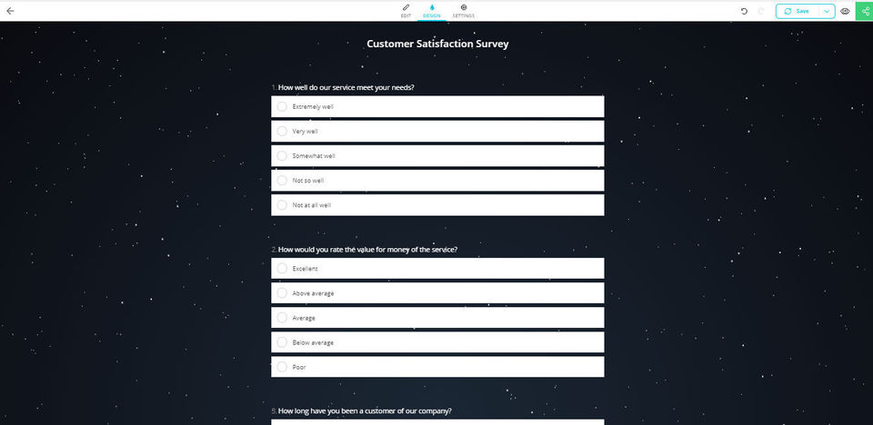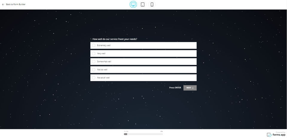 Designing surveys for our business got so much easier as we finally met easily customizable and engaging form builder application forms.app. Customer satisfaction surveys and intracompany employee satisfaction analyses have great importance for us. We are constantly conducting customer satisfaction surveys as our marketing department attaches big importance to market researches and customer satisfaction. Since we have discovered forms.app and its outstanding features recently, we are still learning about it. As we learn more, our work with creating, distributing surveys and receiving high submission rates get higher. The support team also is very caring about answering the questions and delivering the users the best customer experience possible. The applications' website also provides a fast and problem solving live support service so its possible to reach them any time and ask any question. Moreover, its mobile applications are available for Android and IOS. They are very fast in terms of creating a form or survey and designing it. It is also possible to create a survey or check your survey results wherever you want thanks to the mobile applications and its mobile responsive design.
