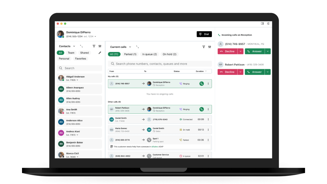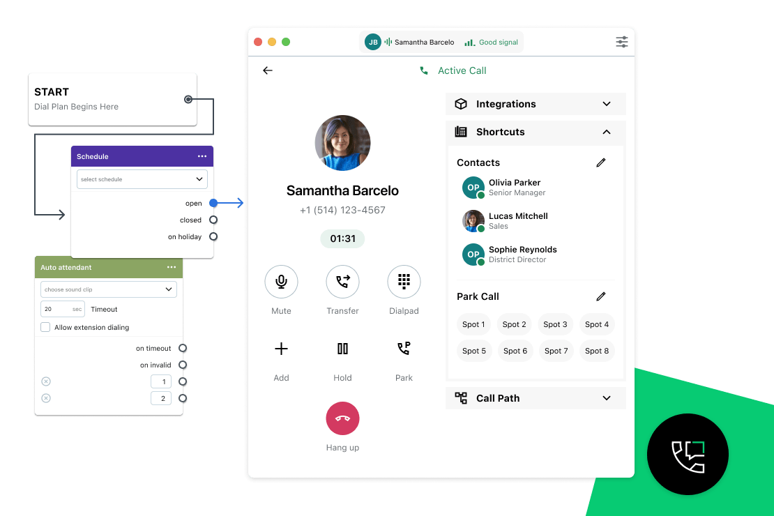 At its core is a visual, drag-and-drop dial plan editor that lets businesses design call flows in minutes—mapping call routing based on hours, holidays, or agent availability . Auto attendants, ring groups, virtual voicemail, fax, intercom, and paging round out the telephony experience. Administrators can utilize advanced admin tools—such as the Attendant Console, reporting and analytics dashboards, number porting, and multi-site management—to oversee and optimize communication workflows