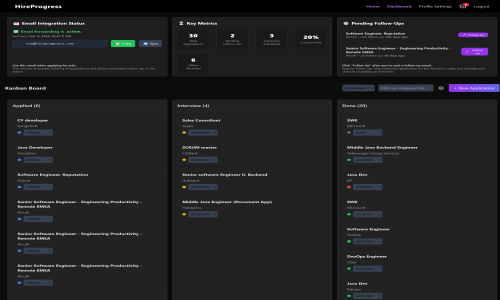 HireProgress.com is a platform designed to assist individuals in managing job applications efficiently. By automating the tracking of applications, follow-ups, and recruiter correspondence, job seekers can stay organized without the need for spreadsheets. The intelligent dashboard provided by HireProgress.com ensures that users can easily monitor and stay on top of every job opportunity. Simplify the application process, keep track of progress, and streamline follow-ups effortlessly with HireProgress.com.